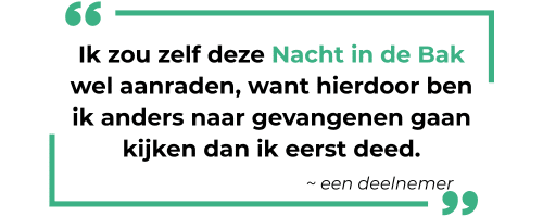 Wat als jij en je groep / klas voor één nacht in de schoenen staan van een gevangene? Nacht in de Bak is een unieke ervaring waarin je op een eigen gekozen locatie opgesloten wordt. Je krijgt te maken met celregels, ervaart hoe het is om je vrijheid kwijt te zijn en hoort de indrukwekkende verhalen van (ex-)gevangenen.